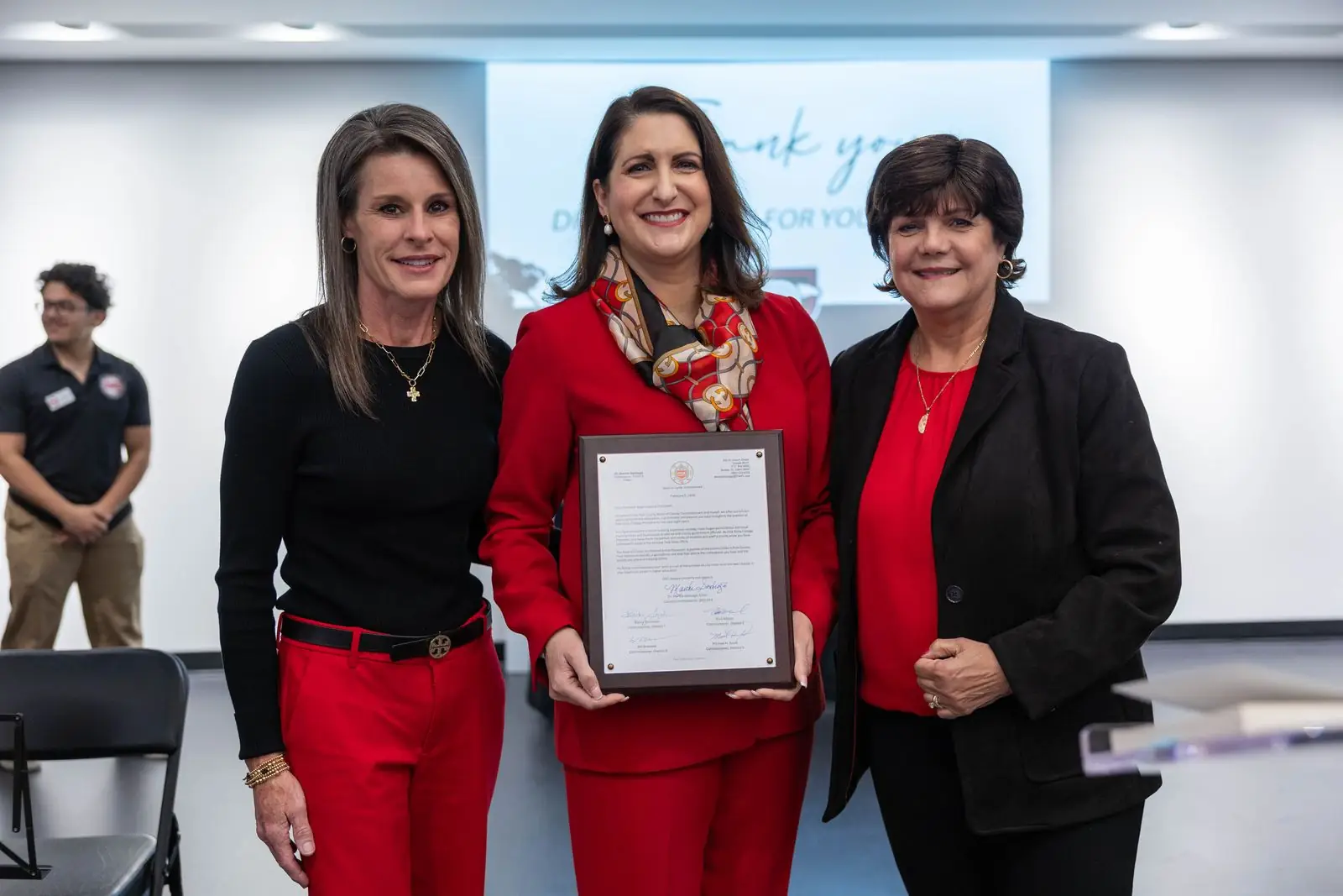 “We offer our sincere appreciation for the dedication, commitment and passion you have brought to the position of president…,” Dr. Santiago read. “You have developed a robust building expansion strategy, forged partnerships with local municipalities and businesses, as well as with county government officials.”