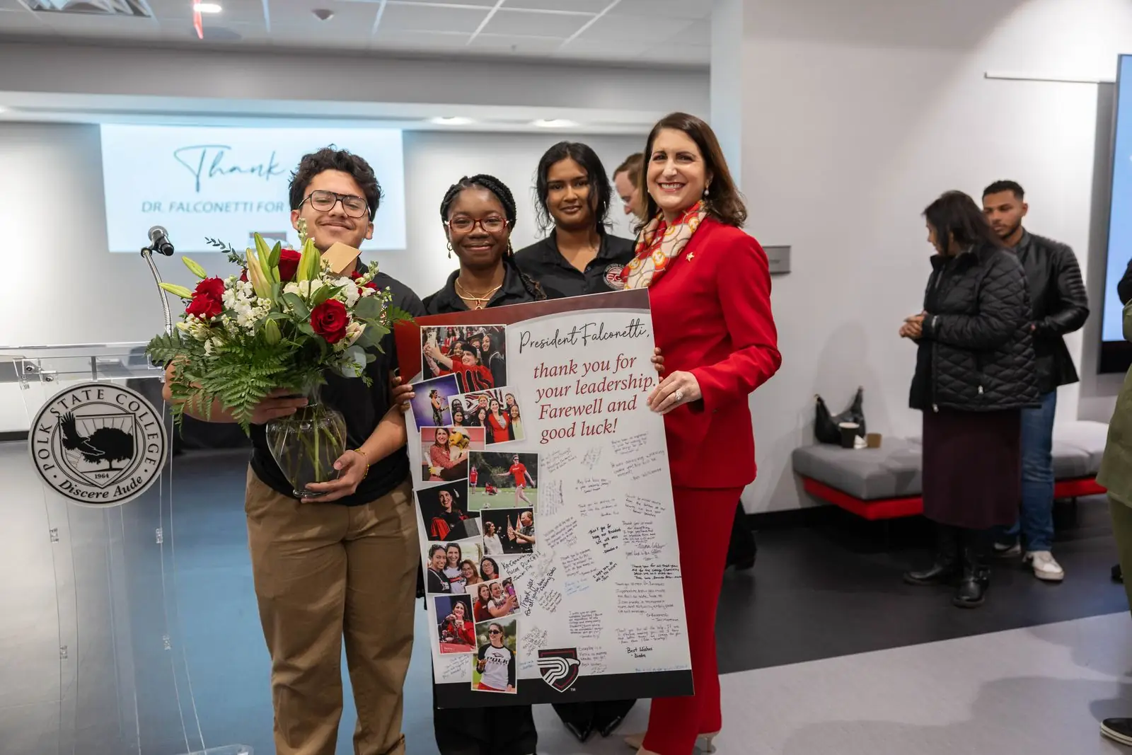 The Polk State Winter Haven Fine Arts Building overflowed with students, faculty, staff and community members on Friday as they celebrated Dr. Angela Garcia Falconetti and wished her farewell as she assumes the interim presidency at the University of North Florida.